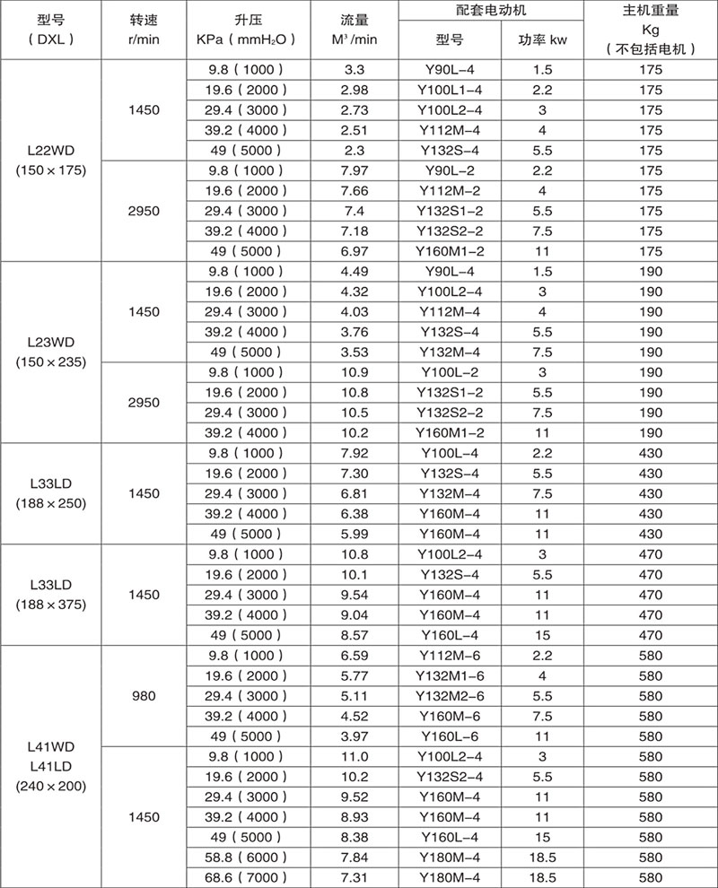 羅茨鼓風(fēng)機(jī)性能參數(shù)表